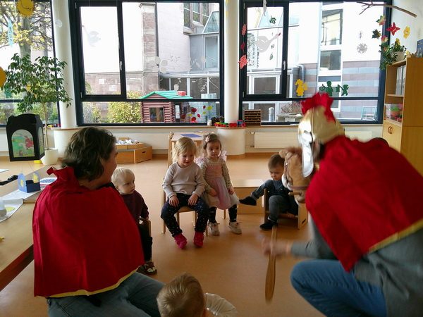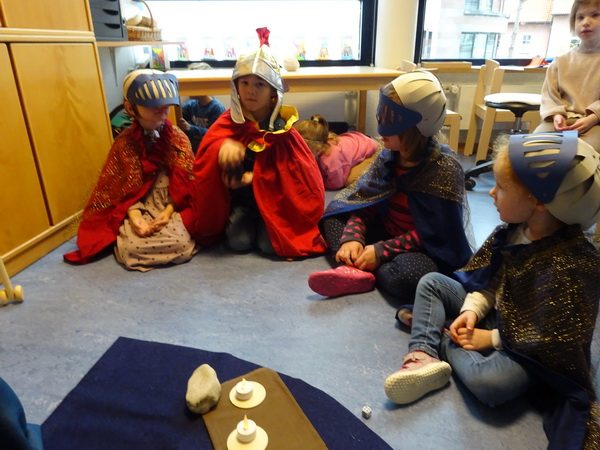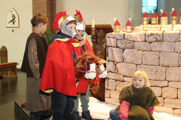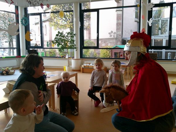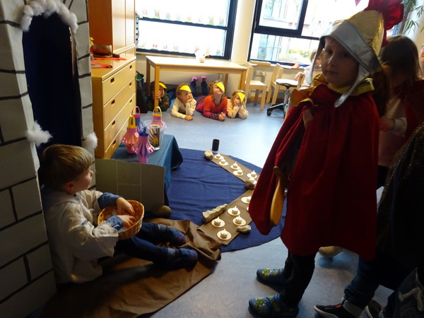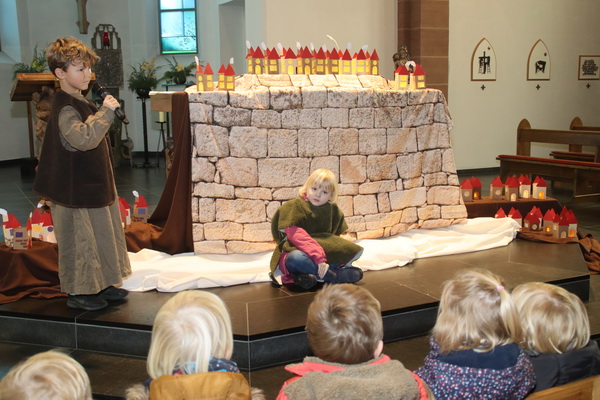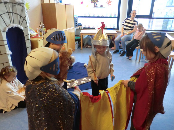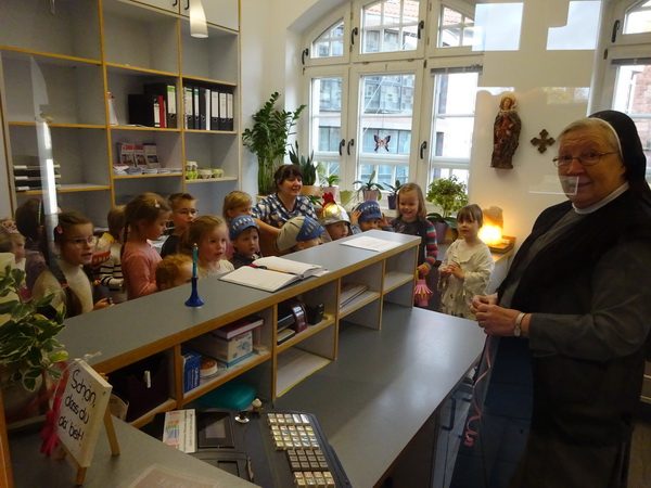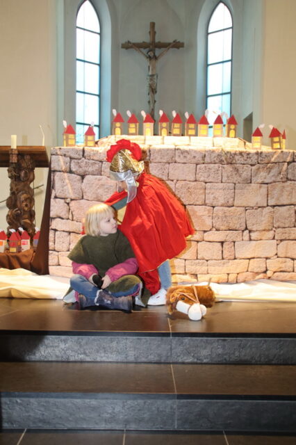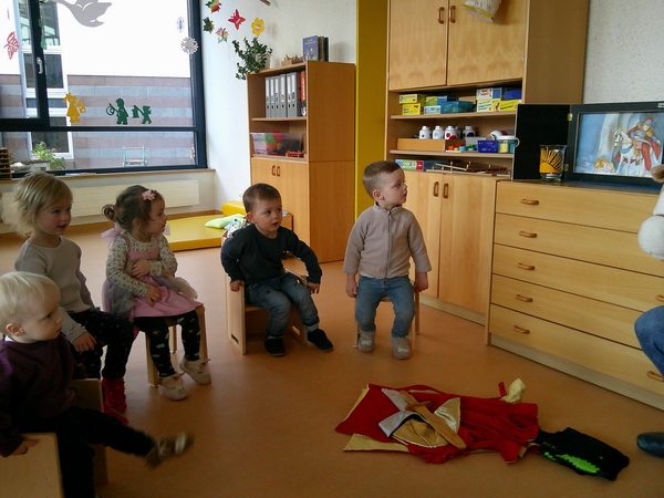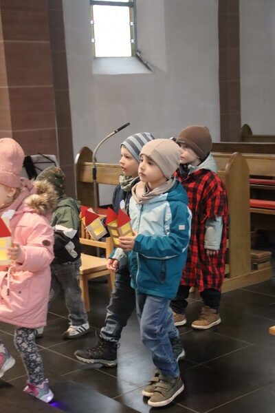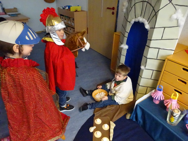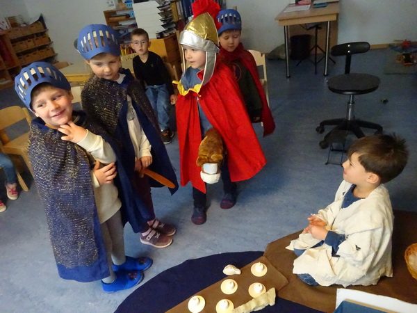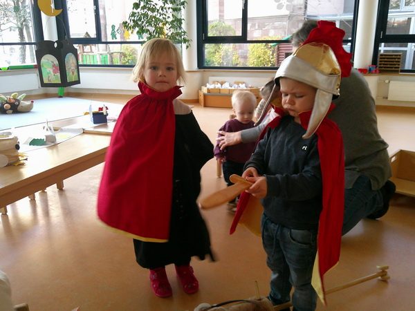 Am Festtag selbst war die Aufregung und Vorfreude groß. Wir begannen mit einem gemütlichen gemeinsamen Frühstück. Danach zogen wir mit unseren gebastelten Laternen durch die Gruppenräume, die Fachschule, durch das Gymnasium oder besuchten Herrn Rektor Kucklick und die Schwestern vom Bergkloster. In einem szenischen Spiel spielten die Kinder die Geschichte vom Heiligen Sankt Martin nach. Mit einfachen Mitteln und viel Begeisterung gelang es den Kindern, die Botschaft von Mitgefühl und Nächstenliebe lebendig werden zu lassen.