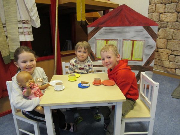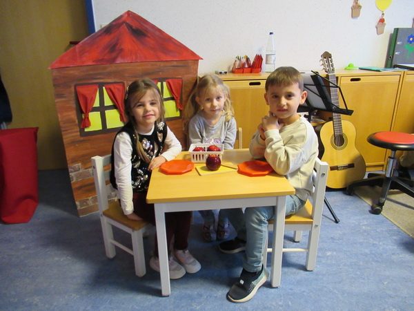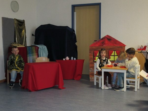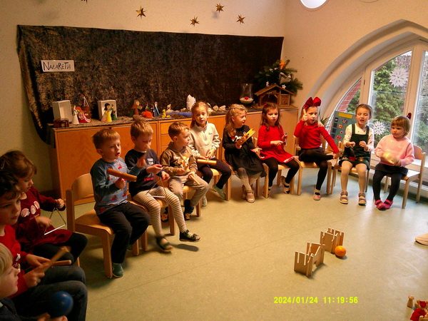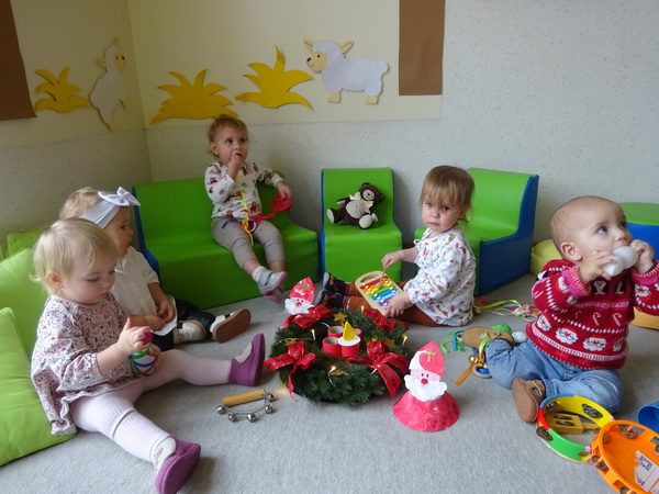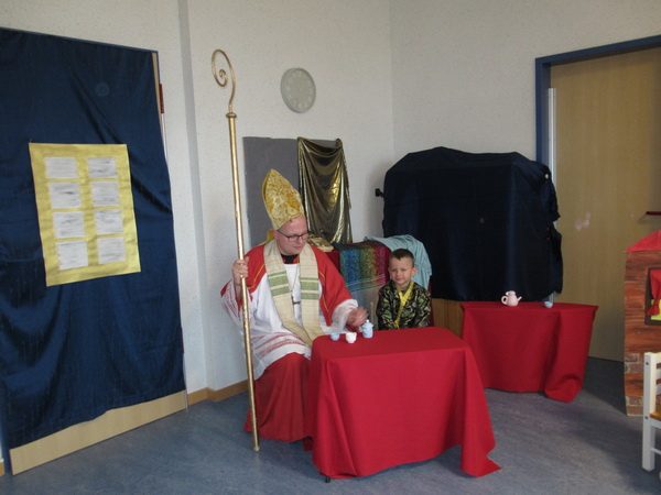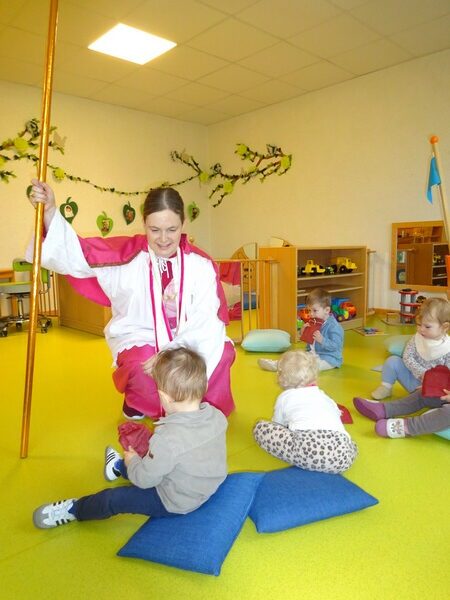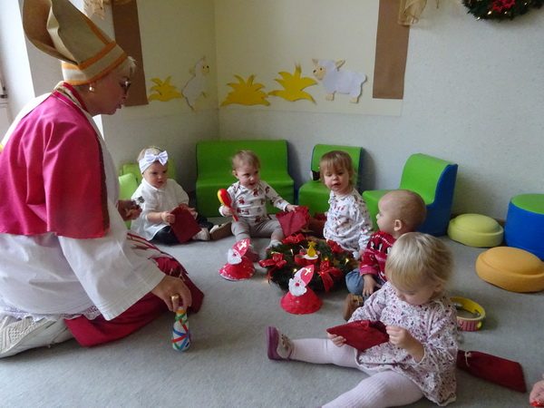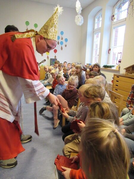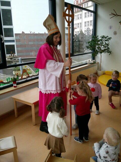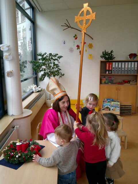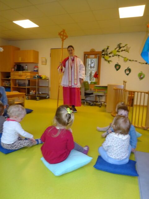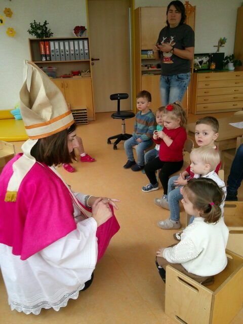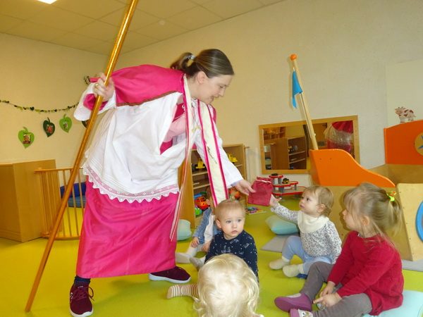 Die Kinder waren schon sehr vertraut mit der Geschichte des Bischofs Nikolaus, sowie mit seiner Kleidung. Dadurch konnten sie ihren Erzieher/innen auch gut beim Anziehen der verschiedenen Kleidungsstücke des Bischofs helfen. Wir sangen gemeinsam Nikolauslieder und spielten verschiedene Legenden nach. Auch die Kleinsten sahen mit staunenden Augen zu und musizierten fröhlich zu den Liedern.